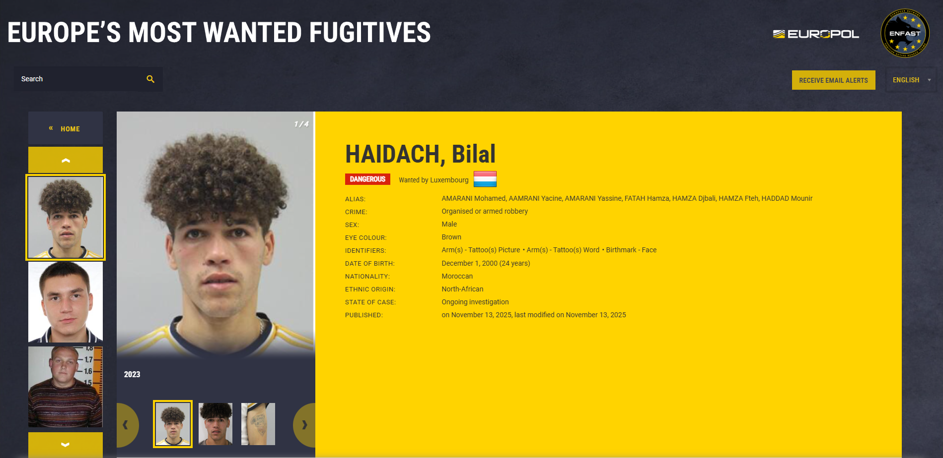 D’Police Lëtzebuerg sicht intensiv no Bilal Haidach, engem 24-järegen Marokkaner, dee vun de lëtzebuergeschen Autoritéiten op d’Lëscht vun de geféierlechsten a meeschten gesichte Krimineller an Europa – der EU Most Wanted – gesat gouf. Eng gréisser international Koordinatioun leeft, fir hien auszefannen an ze verhaften.